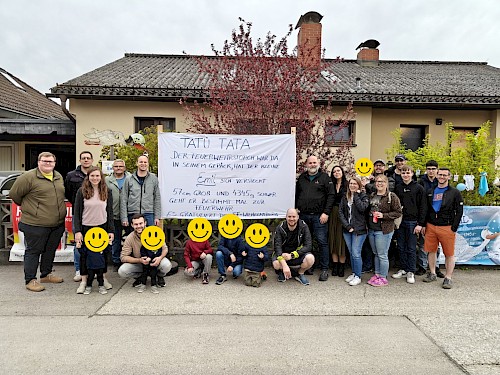 Nur wenige Tage später, am 19. April, ließ es sich die Feuerwehr Wilhelmsburg-Stadt nicht nehmen, dem frischgebackenen Vater und seiner Familie persönlich zu gratulieren. In traditioneller Manier rückten die Kameradinnen und Kameraden aus, um einen Feuerwehrstorch aufzustellen und ein Plakat anzubringen.