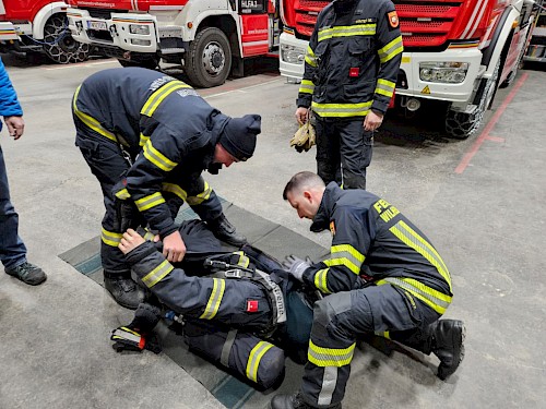 Ein Schwerpunkt lag auf der korrekten Entkleidung eines verunfallten Atemschutzträgers, um eine sichere und effiziente Rettung zu gewährleisten. Dazu gehörten: