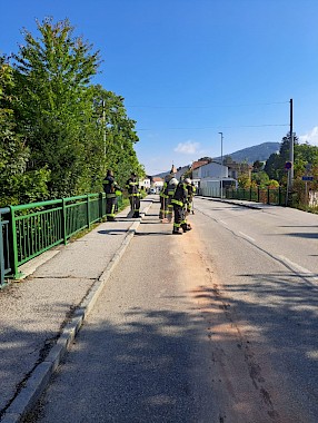 Die Verunreinigung der Fahrbahn stellte eine Gefahr für den Verkehr dar und musste rasch gebunden werden. Mit Ölbindemittel wurde die rund 300 Meter lange Spur abgestreut und so die Rutschgefahr für Autofahrer und Zweiradlenker beseitigt.
