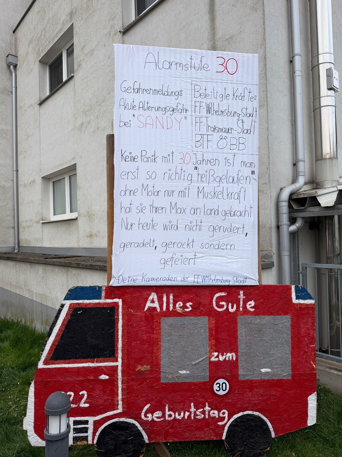 Am 14. April gratulierten die Kameradinnen und Kameraden der Feuerwehr Wilhelmsburg-Stadt ihrer SB Sandra Prerovsky auf besondere Weise zum Geburtstag. Mit einem liebevoll gestalteten Plakat sowie einem Besuch mit dem Feuerwehrauto wurde ihr eine große Freude bereitet.