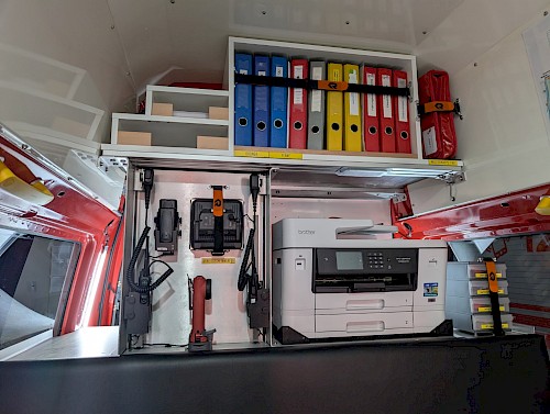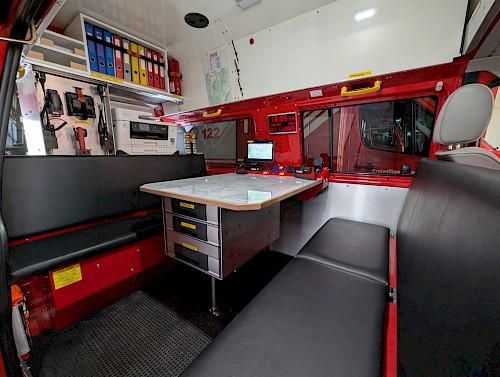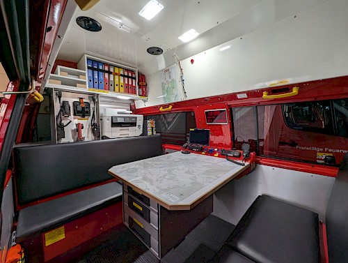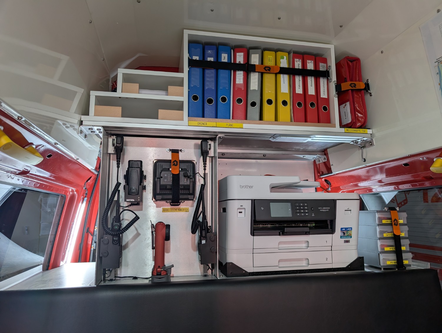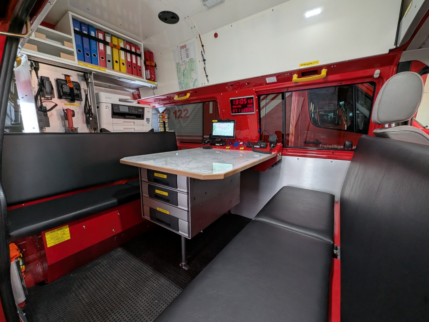 Auch im Innenraum wurde umfassend aufgerüstet. Die Beleuchtung ist nun zwischen Weiß- und Rotlicht umschaltbar, sodass auch während der Fahrt ohne Blendung des Fahrers gearbeitet werden kann. Nach Abschluss der elektrischen Arbeiten wurden Verkleidungen und Sitzbänke wieder eingebaut. Zudem entstand ein neues Regalsystem im Heckbereich, das unter anderem einen modernen Farbdrucker mit Scan- und Kopierfunktion beherbergt.