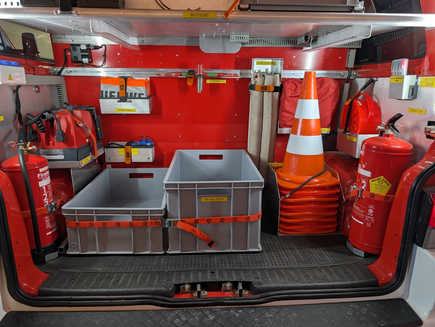 Zur Lageführung wurde ein Whiteboard sowie Taktikfolie und passenden Stiften angebracht. Für die Ausleuchtung von Einsatzstellen steht künftig das portable LED-System Rosenbauer LS2000 zur Verfügung. Zusätzlich wurden neue Kennzeichnungsmittel für die Einsatzabsicherung sowie ein Sanitätsrucksack und Warnüberwürfe für unterschiedliche Rollen ergänzt. Auch die Einsatzunterlagen wurden neu strukturiert und übersichtlich verstaut.