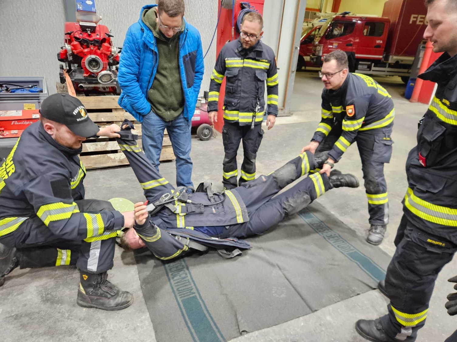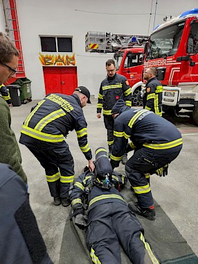 Ein Schwerpunkt lag auf der korrekten Entkleidung eines verunfallten Atemschutzträgers, um eine sichere und effiziente Rettung zu gewährleisten. Dazu gehörten:
