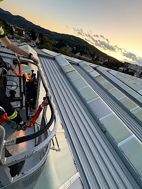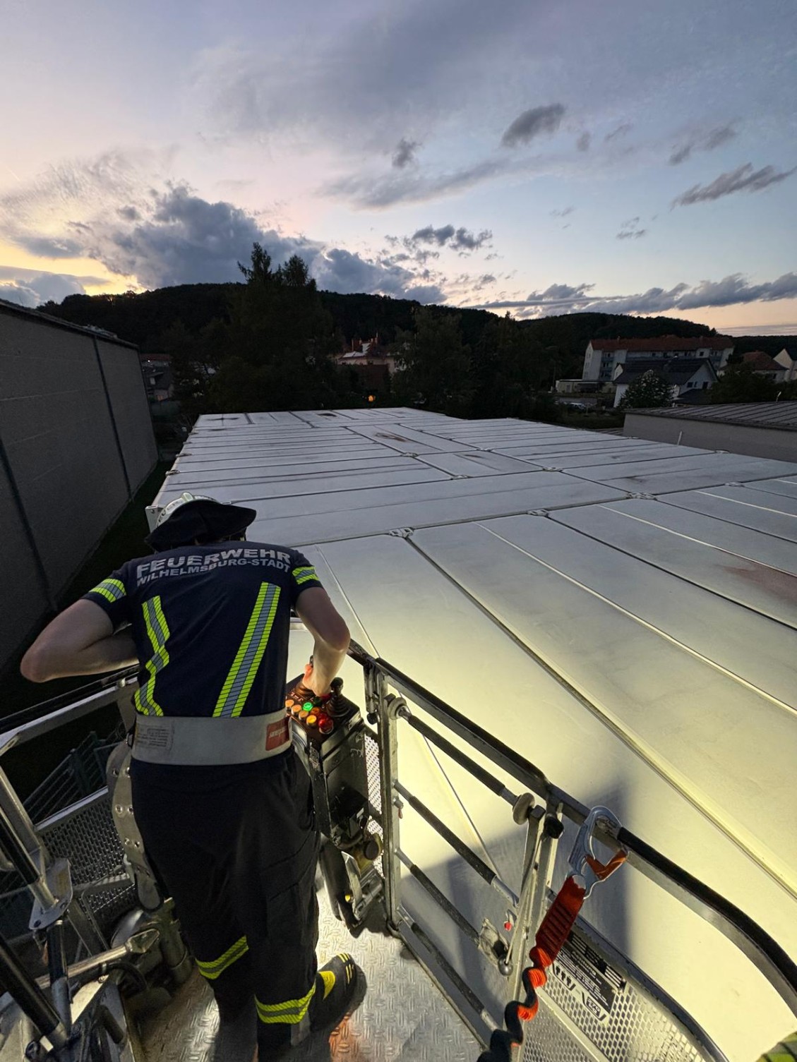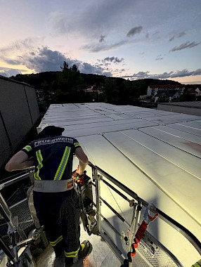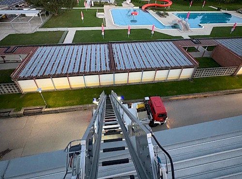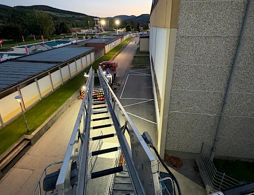 Ein weiterer Ausbildungsteil betraf die Drehleiter, die für realistische Rettungsszenarien eingesetzt wurde. Die Maschinisten hatten die Aufgabe, eine Person sowohl vom Hallendach als auch vom Dach des Kindergartens zu retten – und das ohne ein Umstellen der Leiter. Zusätzlich musste beim Aufstellen darauf geachtet werden, dass weiterhin Fahrzeuge vorbeifahren konnten. Hier stand vor allem das richtige Abschätzen der Reichweite und Belastbarkeit der Leiter im Vordergrund. Auch die Handhabung sowie das präzise Einweisen durch die Mannschaft wurden intensiv trainiert.